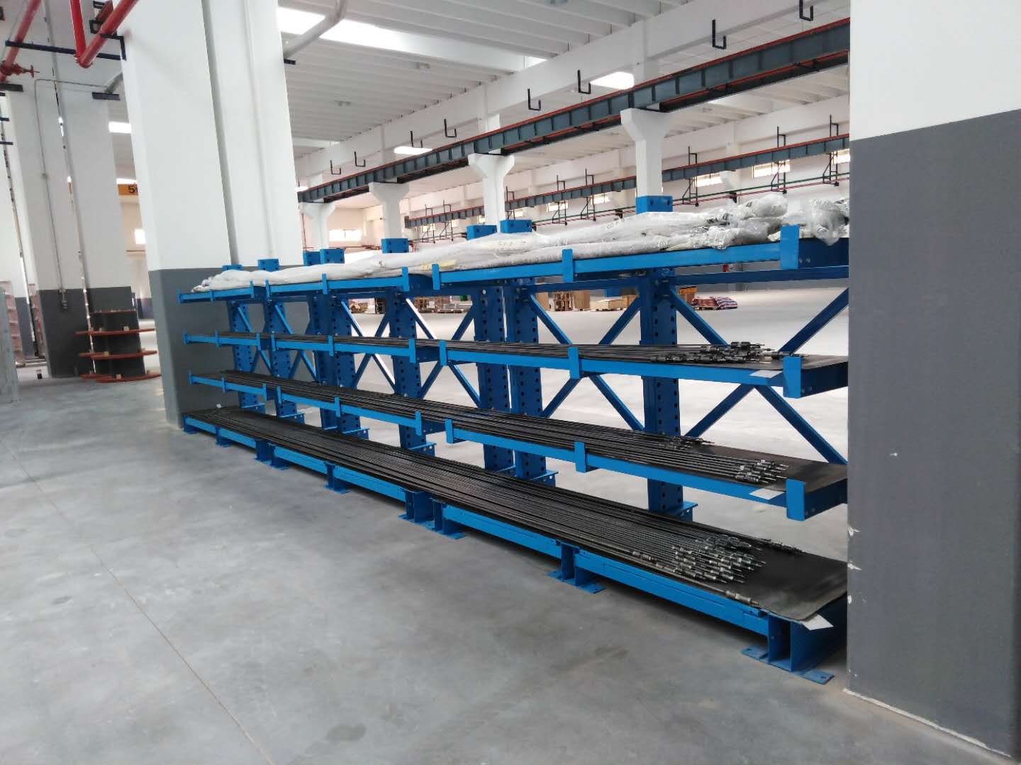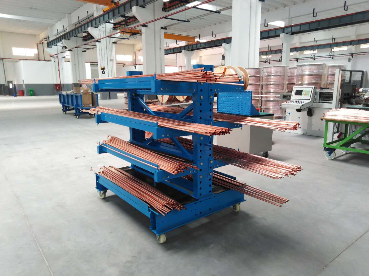 換熱器生產車間,存放鋁管及銅管,原料要求不能變形,設計非標懸臂貨架,鋪設層板,上面放置膠皮,保證原料不變形,而且有膠皮不會磨損。懸臂貨架下面安裝腳輪,便于車間周轉。